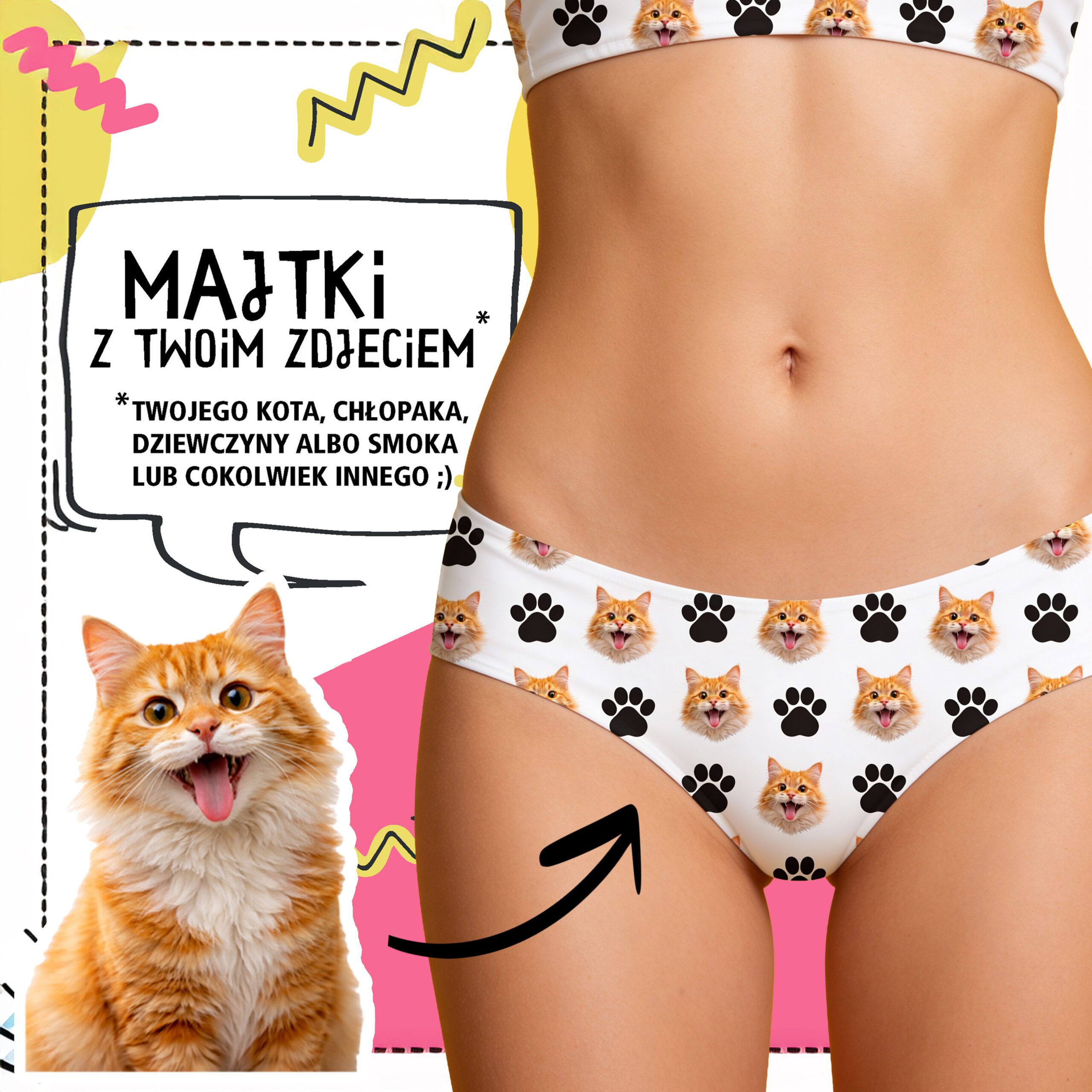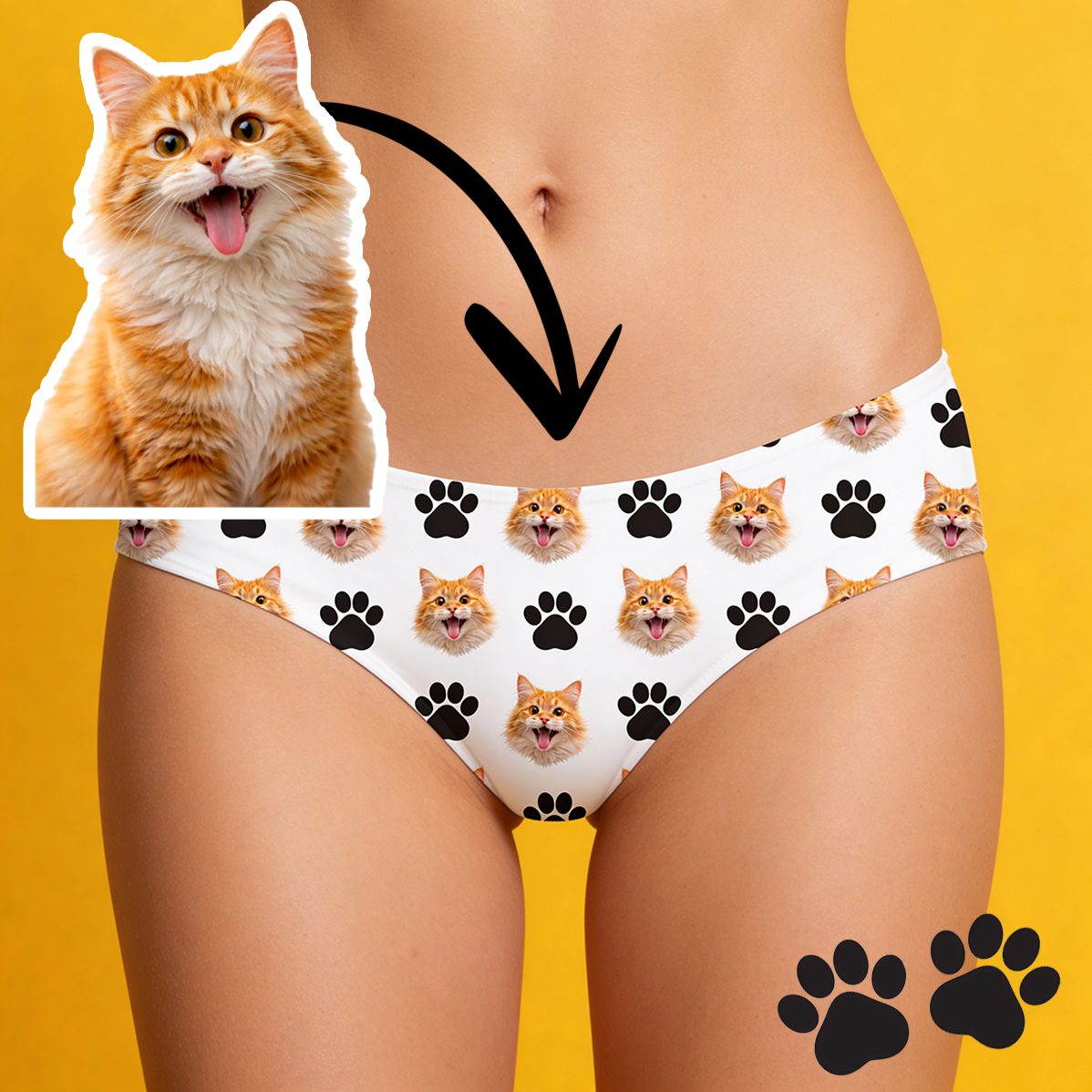 Sexy, wycięte figi, które pięknie podkreślają pośladki. Wzór składa się z łapek oraz zdjęcia pyszczka Twojego zwierzaczka – słodko, zabawnie i totalnie nie do podrobienia.